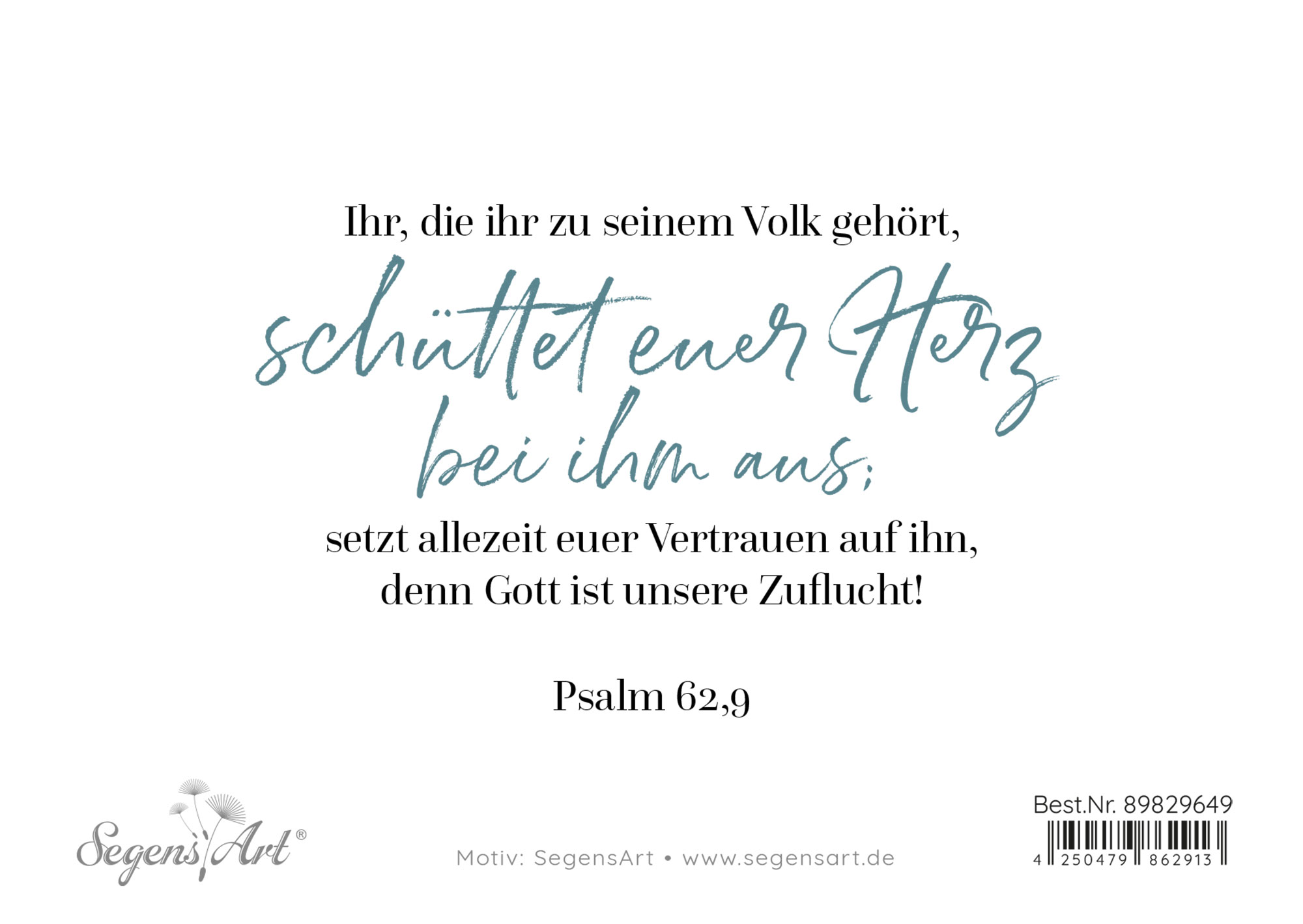Ihr, die ihr zu seinem Volk gehört, schüttet euer Herz bei ihm aus; setzt allezeit euer Vertrauen auf ihn, denn Gott ist unsere Zuflucht!