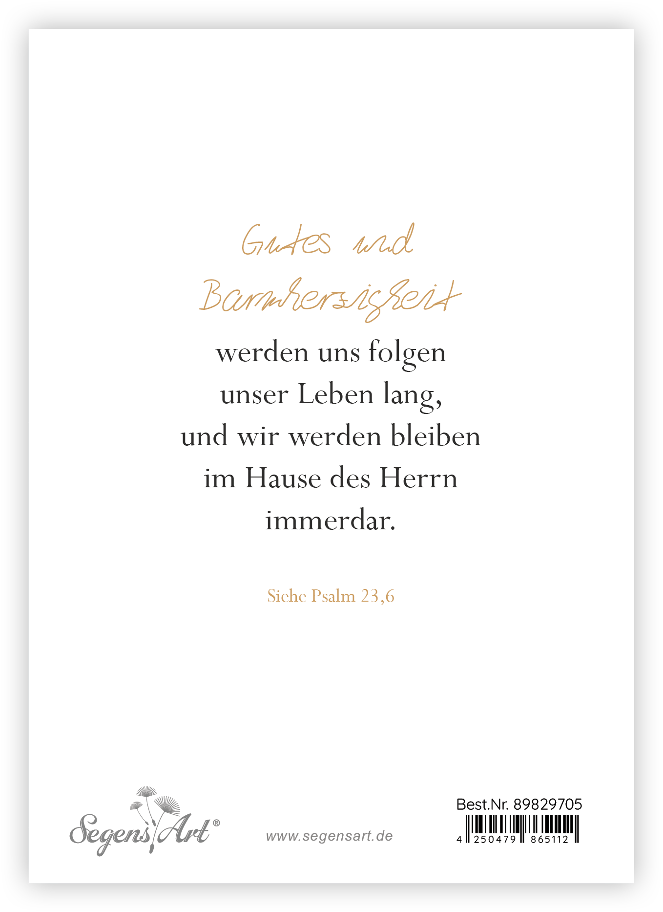 Faltkarte auf Naturpapier mit farbigem Umschlag und Hülle, im Format 10,5 x 14,8 cm (Format inkl. Umschlag 11,5 x 16 cm)Text:Auf euch!Rückseite:Gutes und Barmherzigkeit werden uns folgen unser Leben lang, und wir werden bleiben im Hause des Herrn immerdar.Siehe Psalm 23,6
