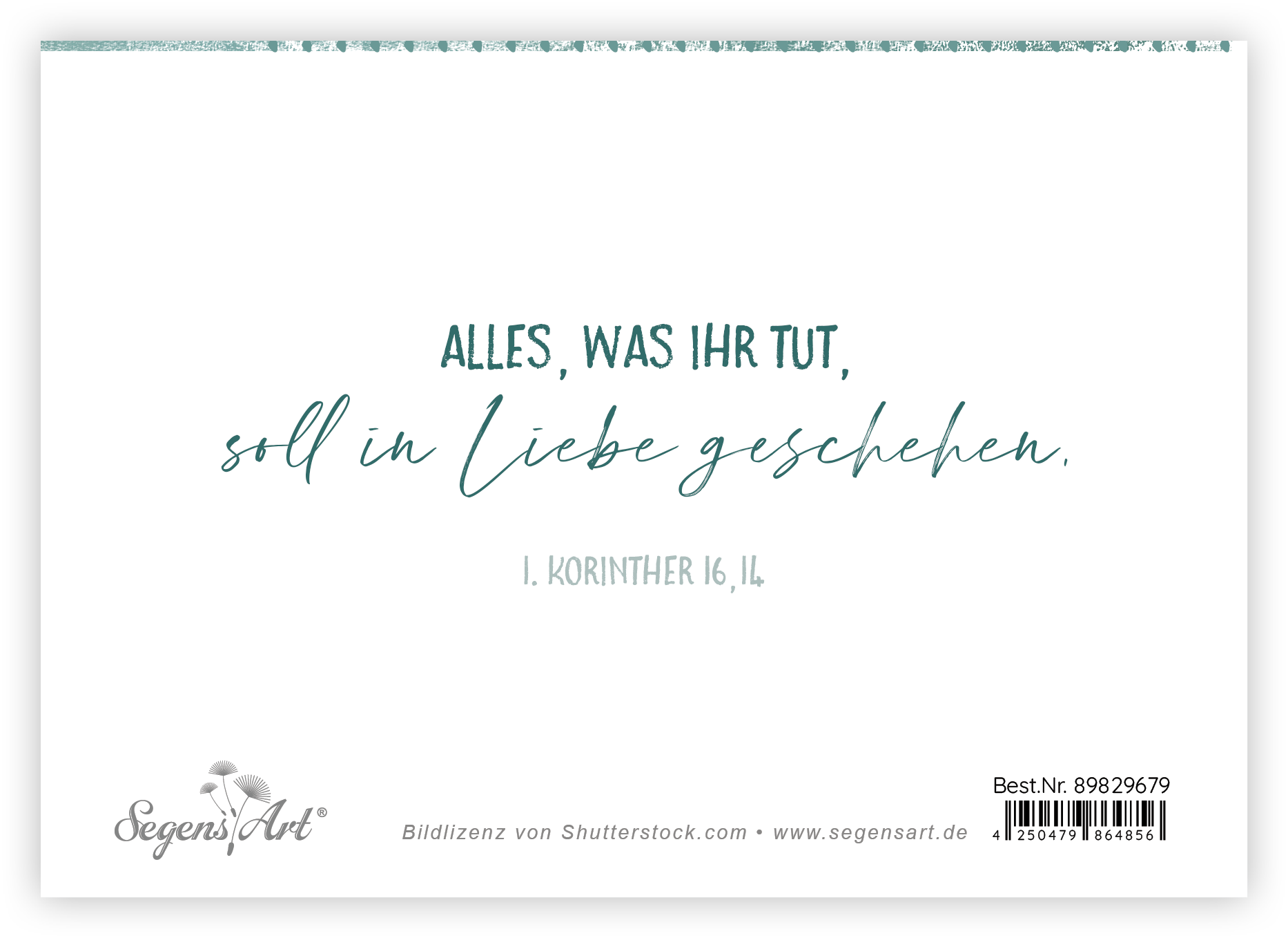 Faltkarte mit farbigem Umschlag und Hülle, im Format 14,8 x 10,5 cm (Format inkl. Umschlag 16 x 11,5 cm)Text:Gottes Segen zur HochzeitRückseite:Alles, was ihr tut, soll in Liebe geschehen. 1. Korinther 16,14