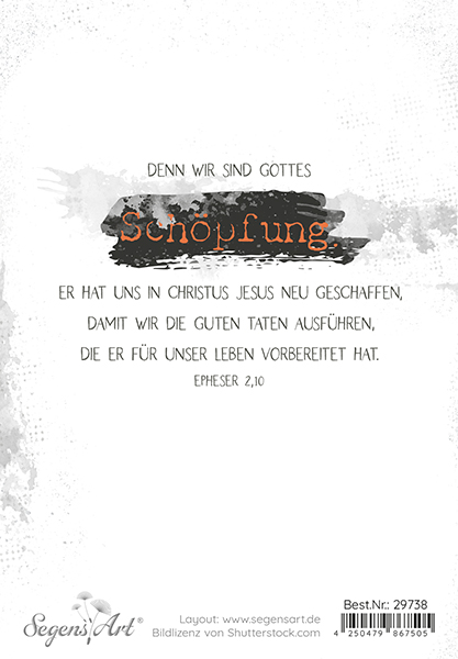 Denn wir sind Gottes Schöpfung. Er hat uns in Christus Jesus neu geschaffen, damit wir die guten Taten ausführen, die er für unser Leben vorbereitet hat. Epheser 2,10