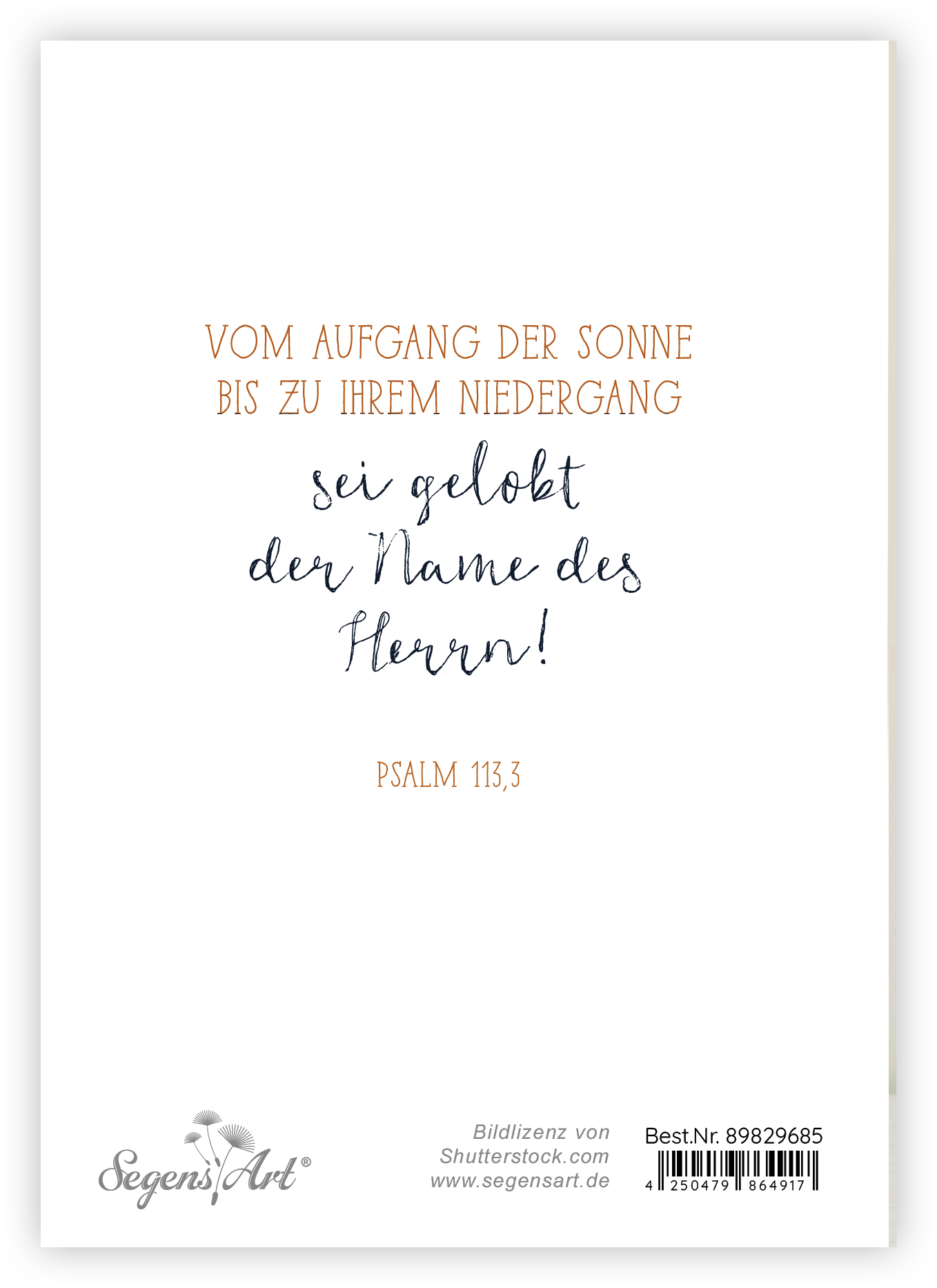 Faltkarte mit farbigem Umschlag und Hülle, im Format 10,5 x 14,8 cm (Format inkl. Umschlag 16 x 11,5 cm)Text:Herzlichen GlückwunschRückseite:Vom Aufgang der Sonne bis zu ihrem Niedergang sei gelobt der Name des Herrn!Psalm 113,3