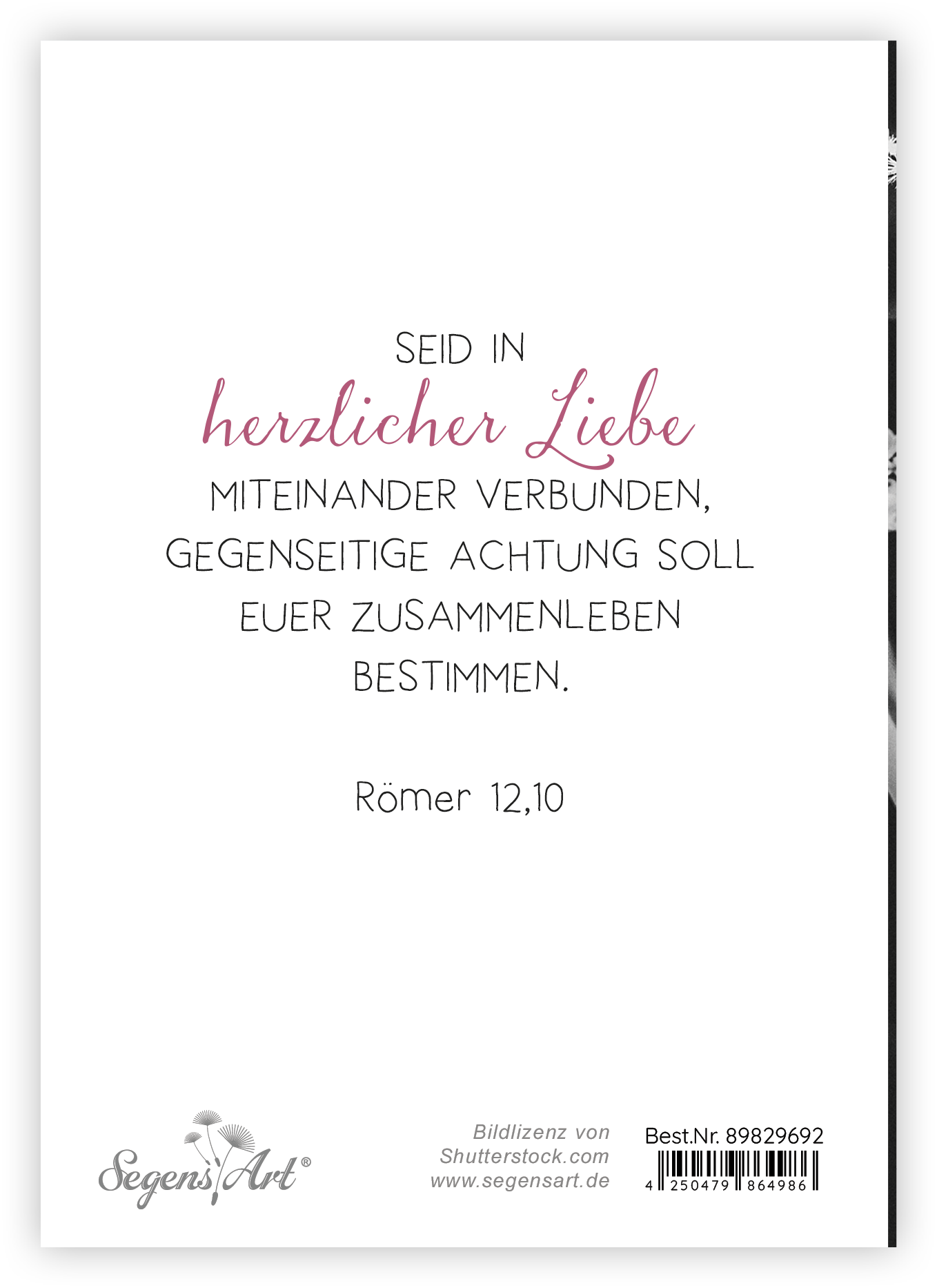 Faltkarte mit farbigem Umschlag und Hülle, im Format 10,5 x 14,8 cm (Format inkl. Umschlag 16 x 11,5 cm)Text:Seid in herzlicher Liebe miteinander verbunden, gegenseitige Achtung soll euer Zusammenleben bestimmen.Römer 12,10