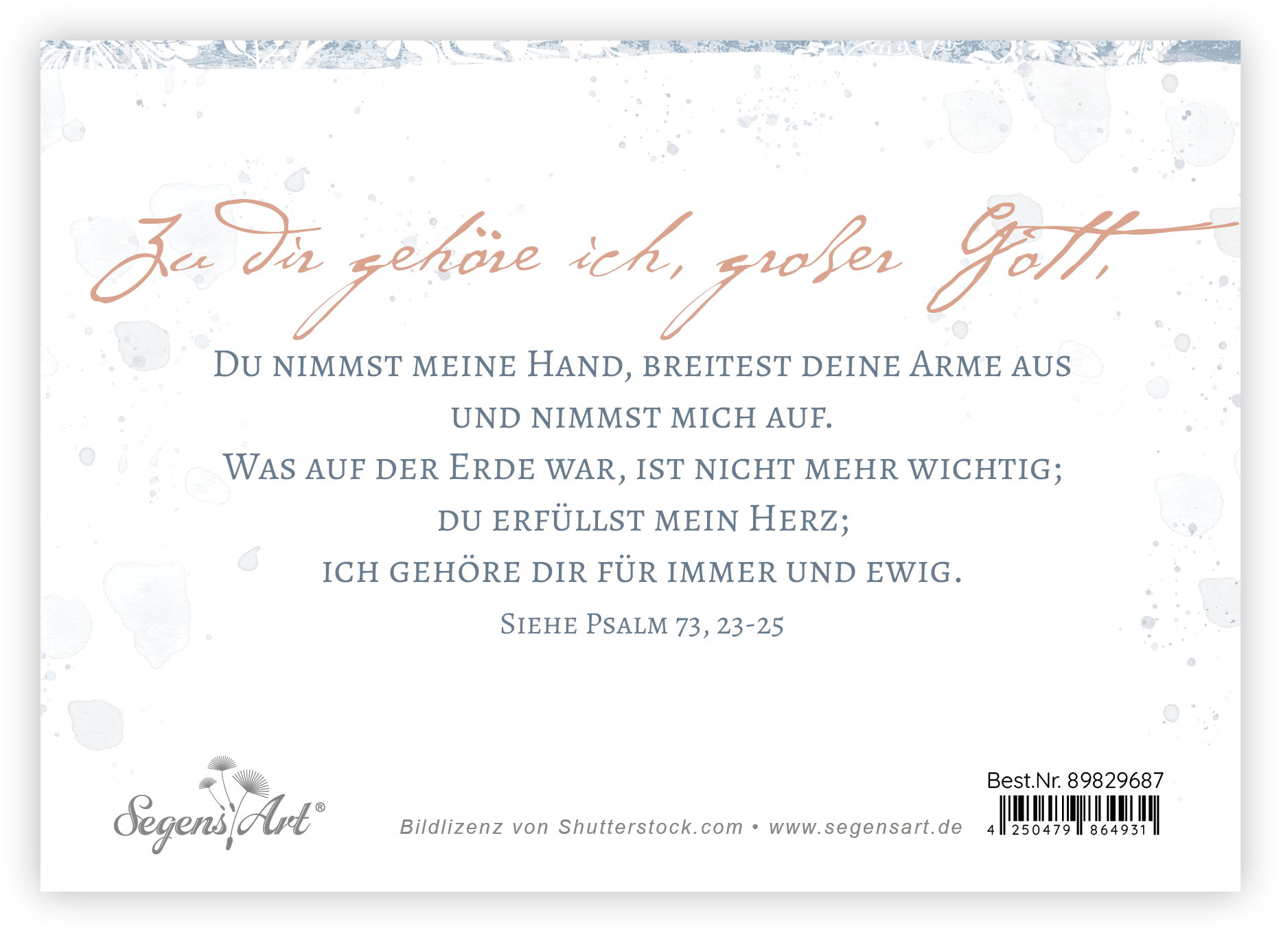 Faltkarte mit farbigem Umschlag und Hülle, im Format 14,8 x 10,5 cm (Format inkl. Umschlag 16 x 11,5 cm)Text:In stiller TrauerRückseite:Zu dir gehöre ich, großer Gott, du nimmst meine Hand, breitest deine Arme aus und nimmst mich auf.Was auf der Erde war, ist nicht mehr wichtig; du erfüllst mein Herz; ich gehöre dir für immer und ewig.Siehe Psalm 73, 23-25