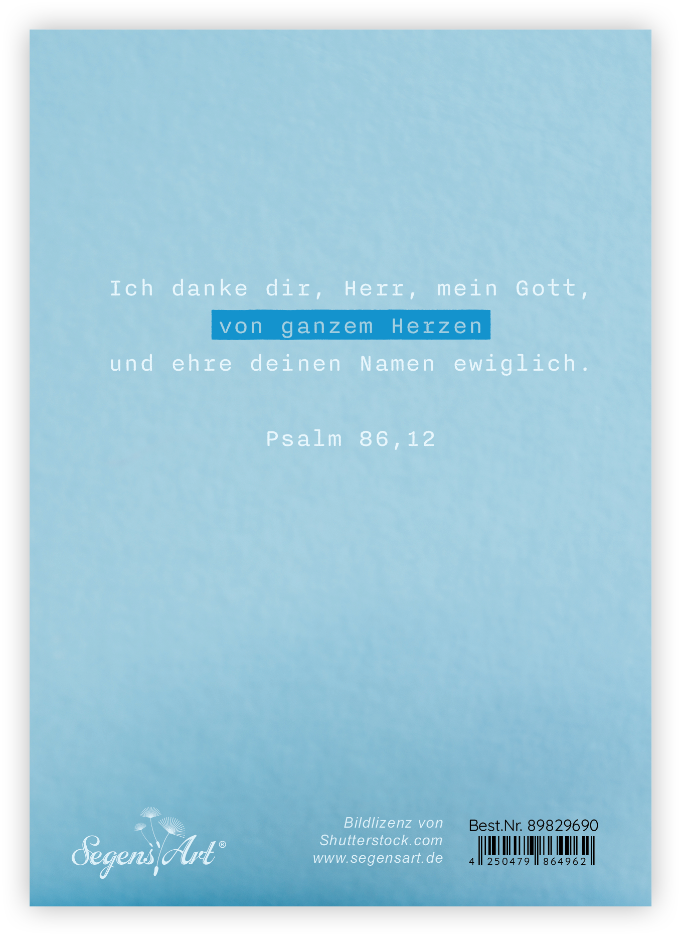 Faltkarte mit farbigem Umschlag und Hülle, im Format 10,5 x 14,8 cm (Format inkl. Umschlag 16 x 11,5 cm)Text:Segen zum GeburtstagRückseite:Ich danke dir, Herr, mein Gott, von ganzem Herzen und ehre deinen Namen ewiglich. Psalm 86,12