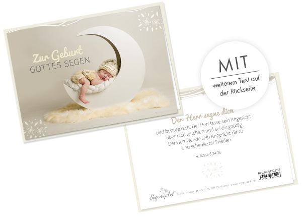 Faltkarte mit farbigem Umschlag und Hülle, im Format 14,8 x 10,5 cm (Format inkl. Umschlag 16 x 11,5 cm)Text:Zur Geburt Gottes SegenRückseite:Der Herr segne dich und behüte dich. Der Herr lasse sein Angesicht über dich leuchten und sei dir gnädig. Der Herr wende sein Angesicht dir zu und schenke dir Frieden.4. Mose 6,24-26