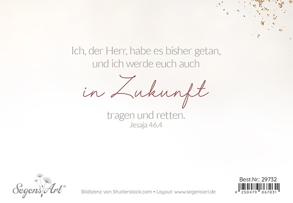 Faltkarte mit farbigem Umschlag und Hülle, im Format 14,8 x 10,5 cm (Format inkl. Umschlag 16 x 11,5 cm)Text:Zur Hochzeit Gottes SegenRückseite:Ich, der Herr, habe es bisher getan, und ich werde euch auch in Zukunft tragen und retten.