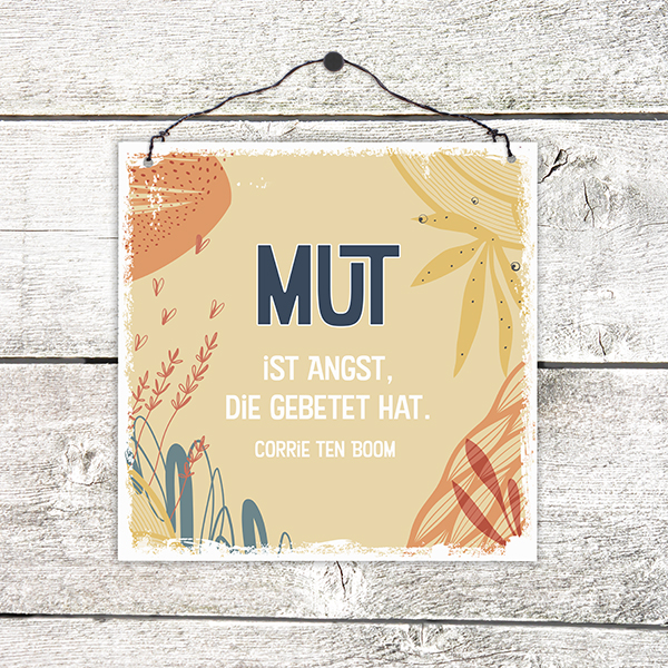 Holzschild im Format 13 x 13 cm, für trockene Innenräume geeignet.Mit doppeltem Draht zum Aufhängen und zusätzlicher Aufstellmöglichkeit - Es wird ein Holzstift mitgeliefert, der einfach auf der Rückseite angebracht werden kann.Handmade - Die Holzschilder werden hier vor Ort von uns produziert.Text:Mut ist Angst, die gebetet hat.Corrie ten Boom