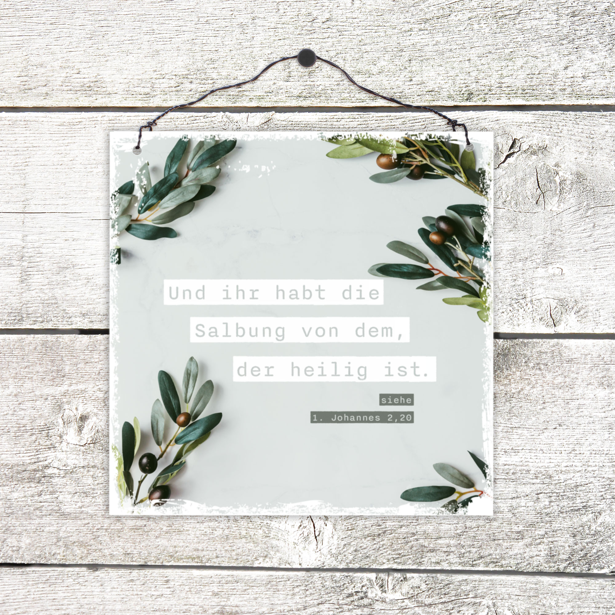 Holzschild im Format 13 x 13 cm, für trockene Innenräume geeignet.Mit doppeltem Draht zum Aufhängen und zusätzlicher Aufstellmöglichkeit - Es wird ein Holzstift mitgeliefert, der einfach auf der Rückseite angebracht werden kann.Handmade - Die Holzschilder werden hier vor Ort von uns produziert.Text:Und ihr habt die Salbung von dem, der heilig ist.siehe 1. Johannes 2,20