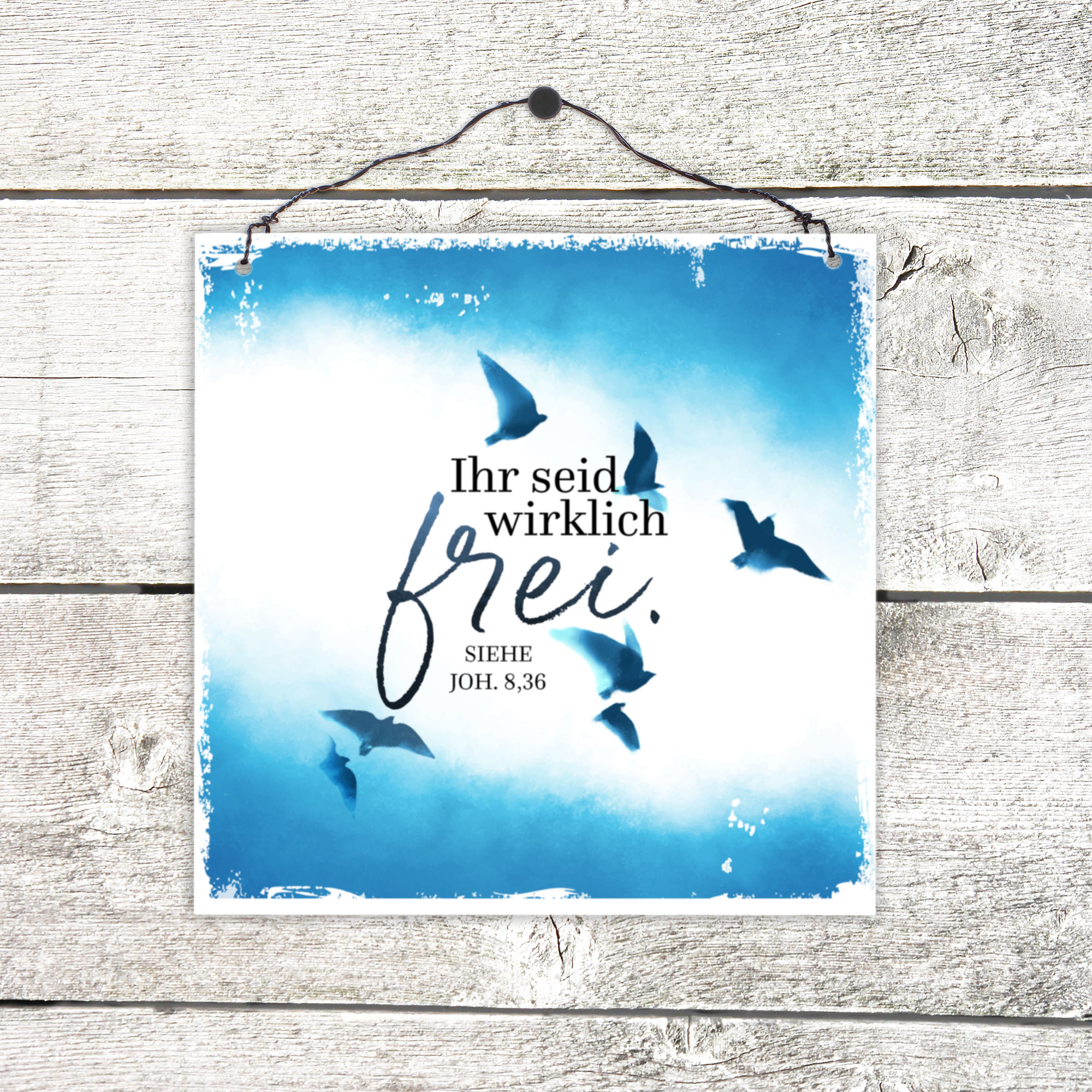 Holzschild im Format 13 x 13 cm, für trockene Innenräume geeignet.Mit doppeltem Draht zum Aufhängen und zusätzlicher Aufstellmöglichkeit - Es wird ein Holzstift mitgeliefert, der einfach auf der Rückseite angebracht werden kann.Handmade - Die Holzschilder werden hier vor Ort von uns produziert.Text:Ihr seid wirklich frei.Siehe Joh. 8,36