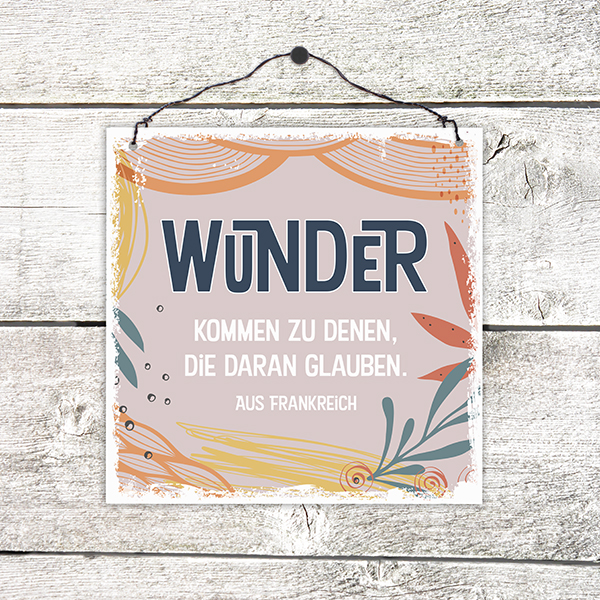 Holzschild im Format 13 x 13 cm, für trockene Innenräume geeignet.Mit doppeltem Draht zum Aufhängen und zusätzlicher Aufstellmöglichkeit - Es wird ein Holzstift mitgeliefert, der einfach auf der Rückseite angebracht werden kann.Handmade - Die Holzschilder werden hier vor Ort von uns produziert.Text:Wunder kommen zu denen, die daran glauben.Aus Frankreich