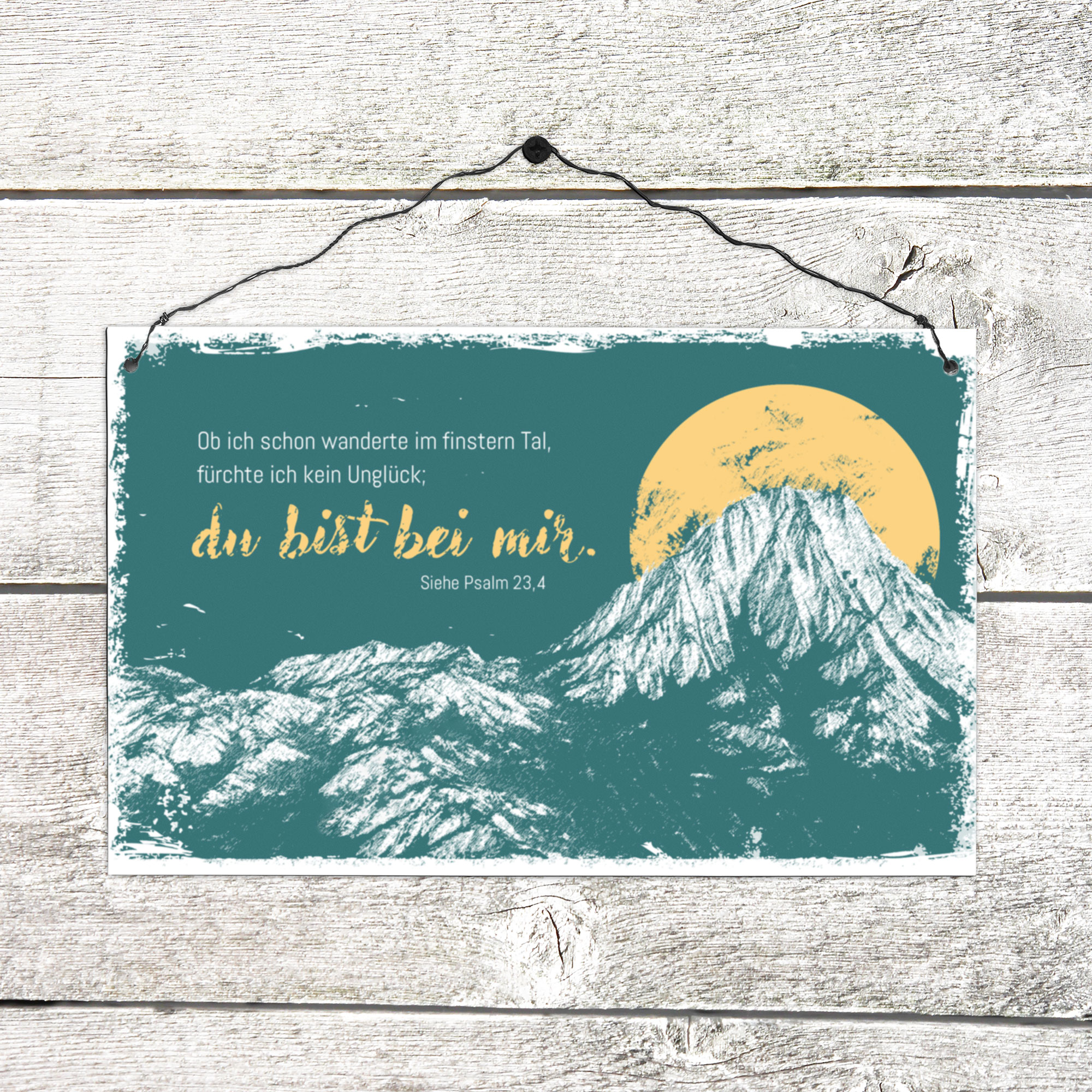 Holzschild im Format 21 x 13 cm, für trockene Innenräume geeignet.Mit doppeltem Draht zum Aufhängen und zusätzlicher Aufstellmöglichkeit - Es wird ein Holzstift mitgeliefert, der einfach auf der Rückseite angebracht werden kann.Handmade - Die Holzschilder werden hier vor Ort von uns produziert.Text:Ob ich schon wanderte im finstern Tal, fürchte ich kein Unglück, du bist bei mir.