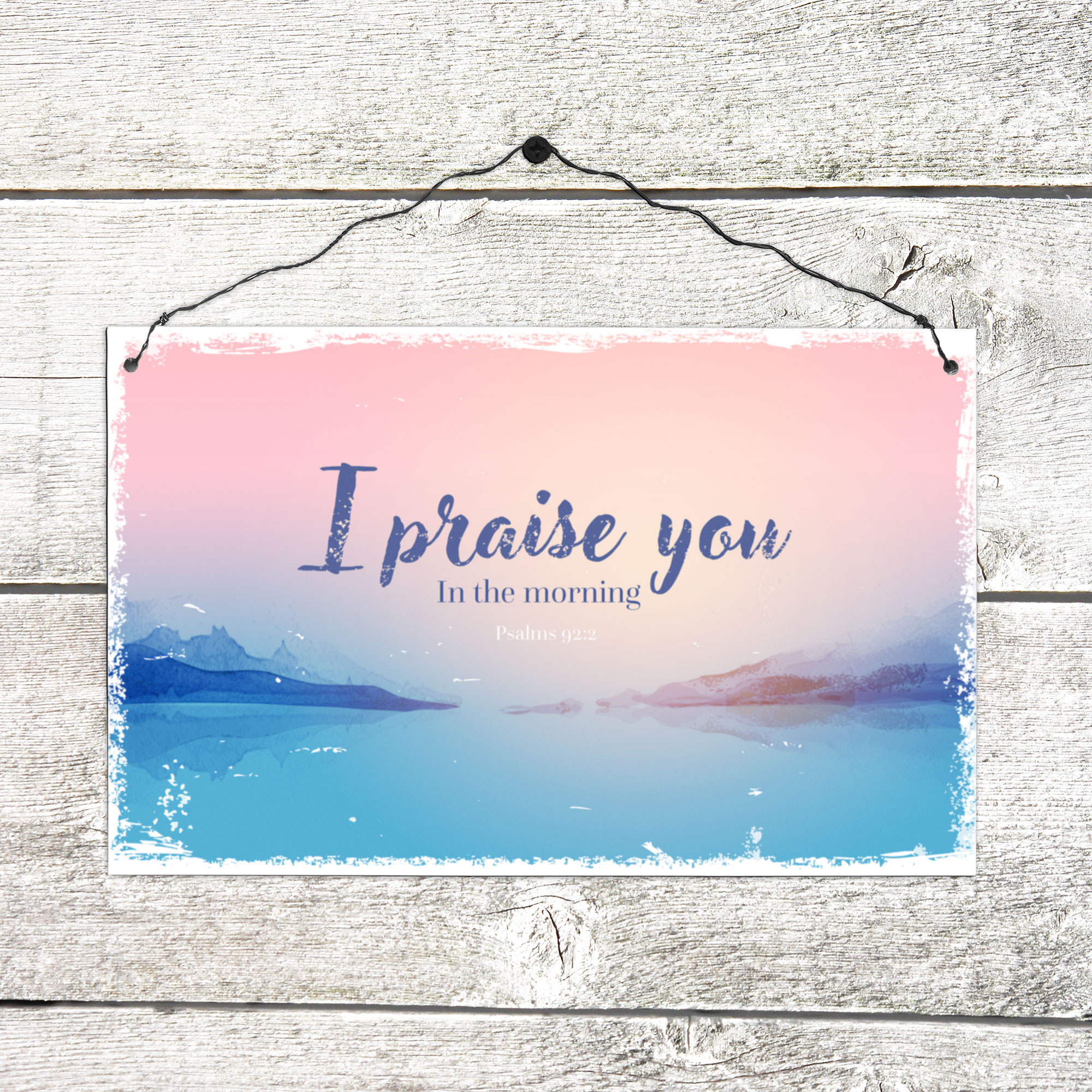 Holzschild im Format 21 x 13 cm, für trockene Innenräume geeignet.Mit doppeltem Draht zum Aufhängen und zusätzlicher Aufstellmöglichkeit - Es wird ein Holzstift mitgeliefert, der einfach auf der Rückseite angebracht werden kann.Handmade - Die Holzschilder werden hier vor Ort von uns produziert.Text:I praise you in the morning