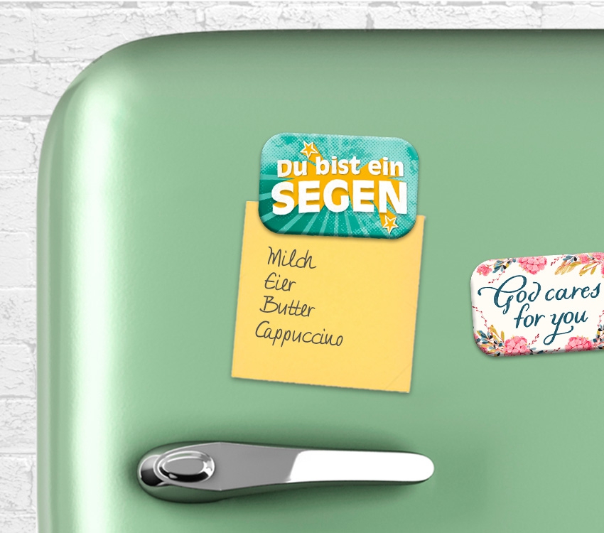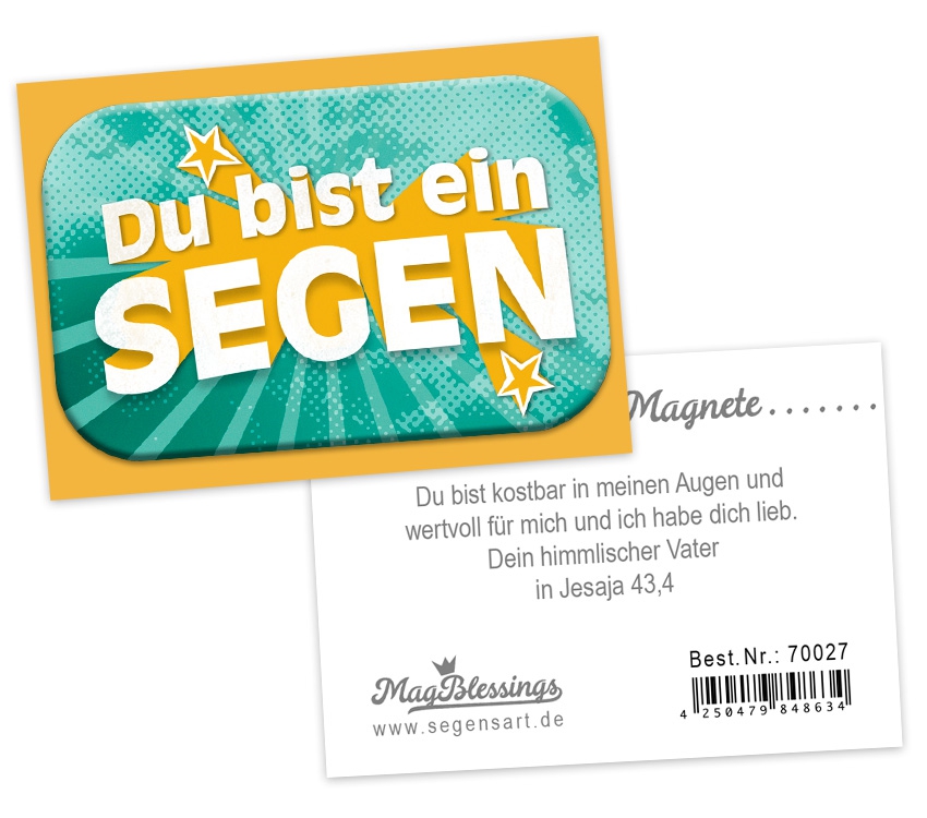 Der Magnet und ein farbiges Kärtchen mit Bibelzitat auf der Rückseite sind zusammen in einer Folie verpackt.