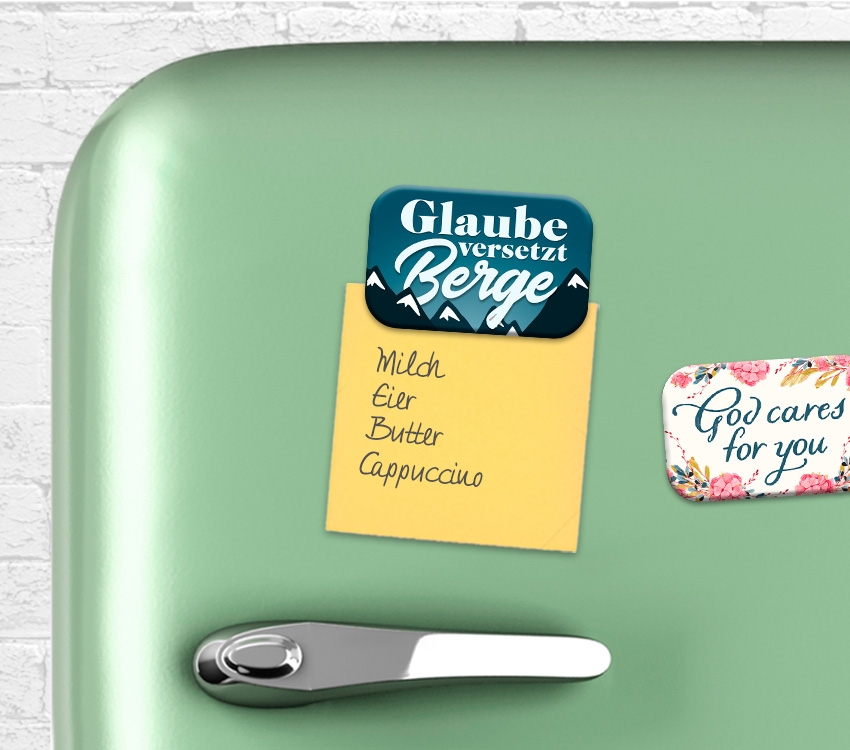 ist das Motiv des Magneten zu sehen, auf der Rückseite befindet sich ein passendes Bibelzitat.