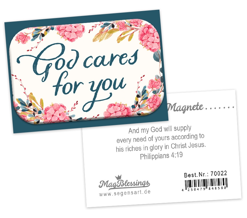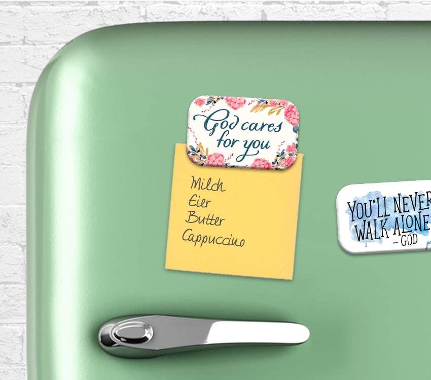 Der Magnet und ein farbiges Kärtchen mit Bibelzitat auf der Rückseite sind zusammen in einer Folie verpackt.