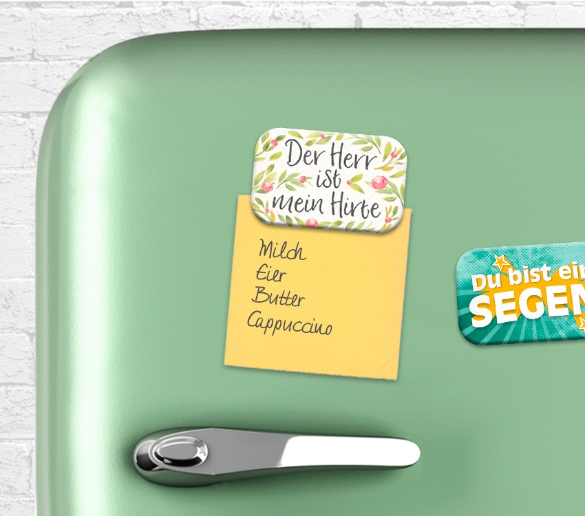 Der Magnet und ein farbiges Kärtchen mit Bibelzitat auf der Rückseite sind zusammen in einer Folie verpackt.