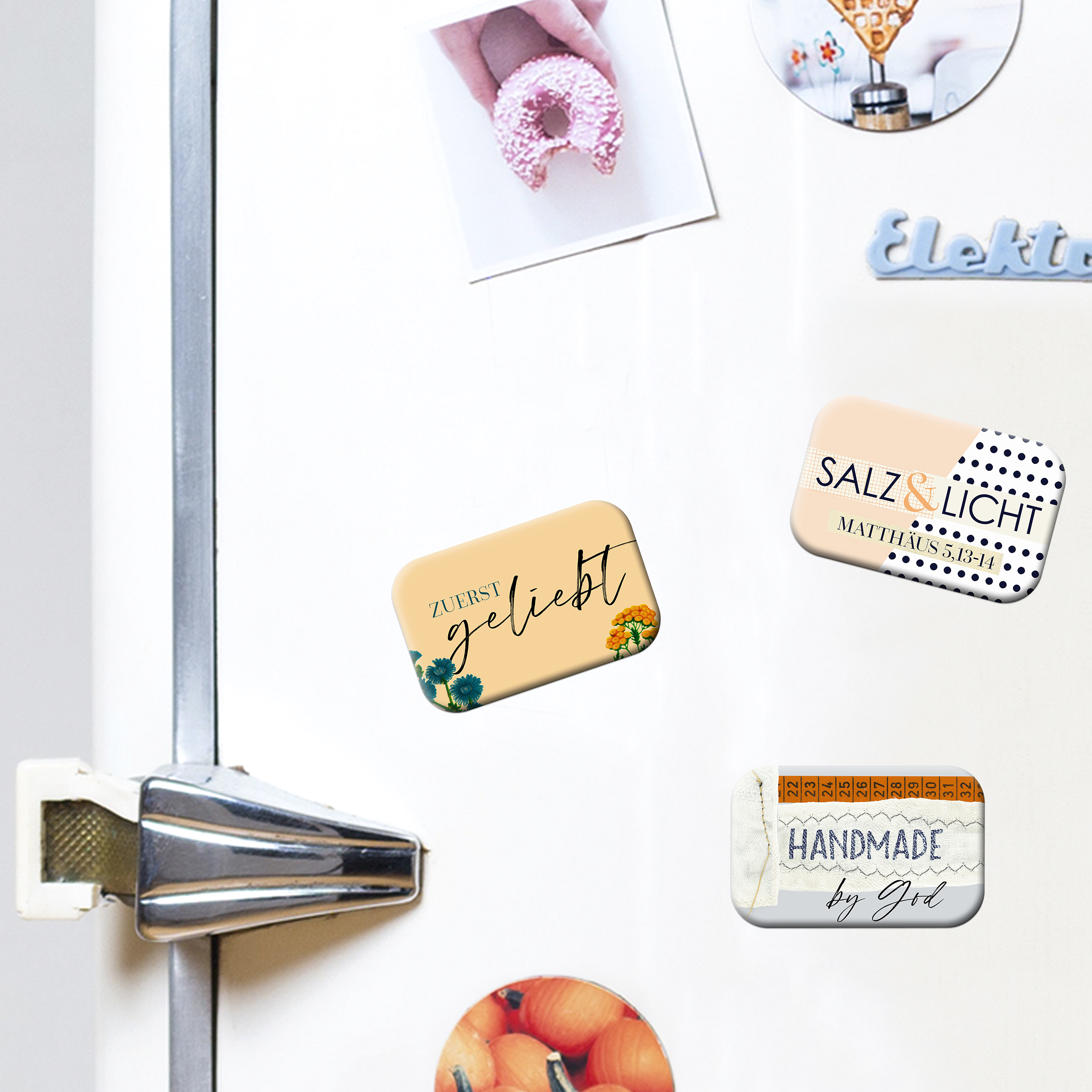 Der Magnet ist zusammen mit einem Minikärtchen in einer Folie verpackt. Auf der Vorderseite des Kärtchens ist das Motiv des Magneten zu sehen, auf der Rückseite befindet sich ein passendes Bibelzitat.