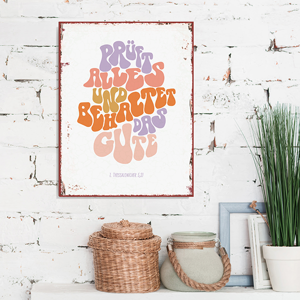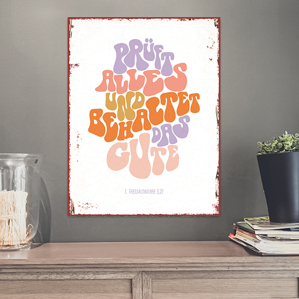 Metallschild im Vintage-Look im Format 27 x 35 cm, für trockene Innenräume geeignet, zum AufhängenHandmade - Die Metallschilder werden hier vor Ort von uns produziert.Text:Prüft alles und behaltet das Gute.