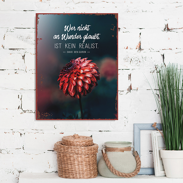 Metallschild im Vintage-Look im Format 27 x 35 cm, für trockene Innenräume geeignet, zum AufhängenHandmade - Die Metallschilder werden hier vor Ort von uns produziert.Text:Wer nicht an Wunder glaubt, ist kein Realist.