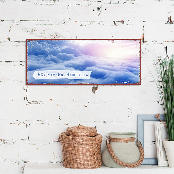 Metallschild im Vintage-Look im Format 34,5 x 14 cm, für trockene Innenräume geeignet, zum AufhängenHandmade - Die Metallschilder werden hier vor Ort von uns produziert.Text:Bürger des Himmels.