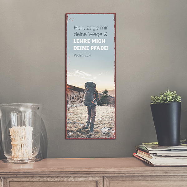 Metallschild im Format 34,5 x 14 cm, für trockene Innenräume geeignet, zum AufhängenHandmade - Die Metallschilder werden hier vor Ort von uns produziert.Text:HERR, zeige mir deine Wege & lehre mich deine Pfade!