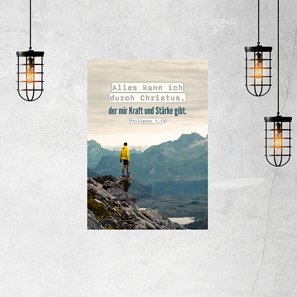 Poster, bunt, im Format DIN A3 (29,7 x 42 cm)Eine samtig matte Beschichtung sorgt für eine angenehme Haptik und schützt die Oberfläche des Posters vor Verschmutzung.Text:Alles kann ich durch Christus, der mir Kraft und Stärke gibt.