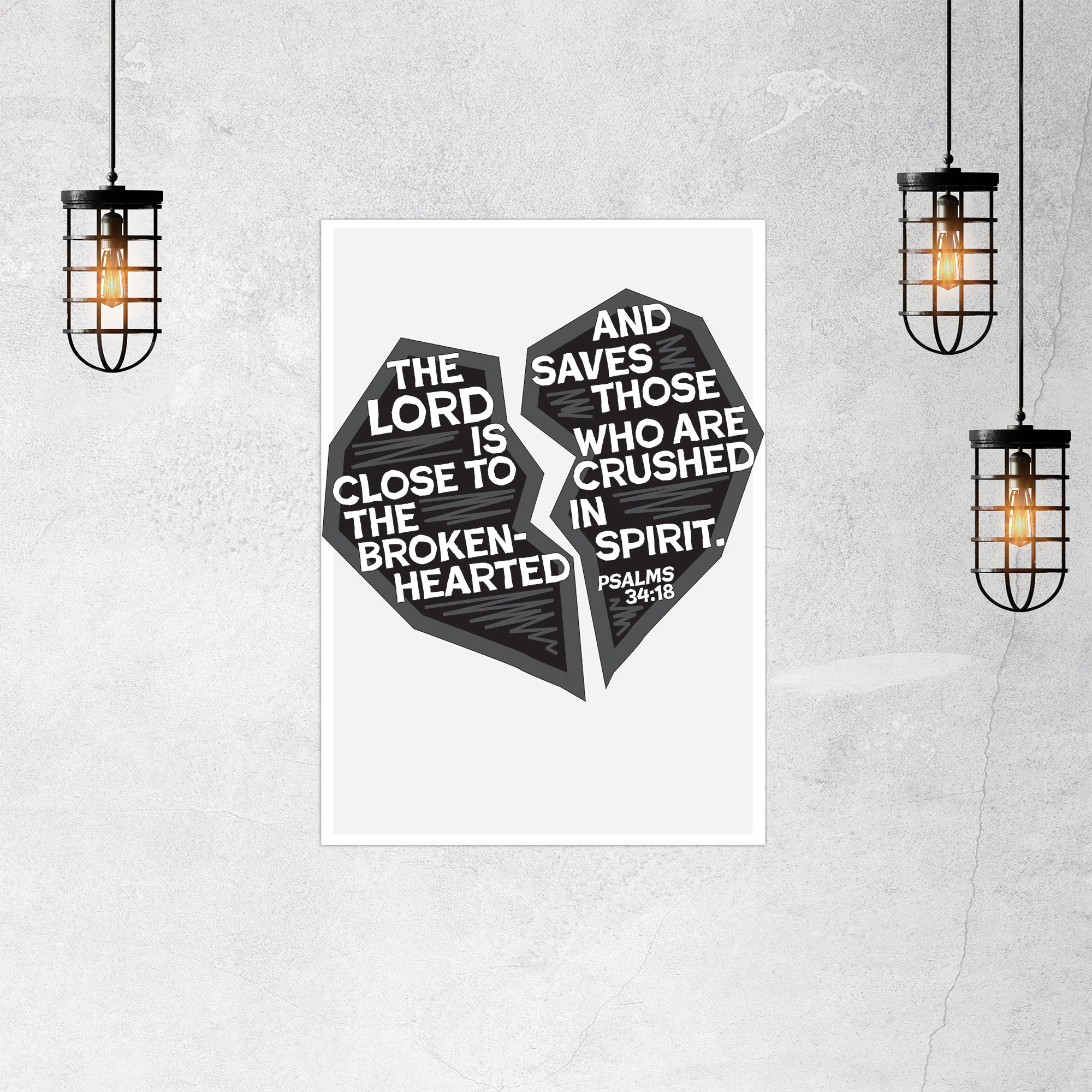 Poster, bunt, im Format DIN A3 (29,7 x 42 cm)Eine samtig matte Beschichtung sorgt für eine angenehme Haptik und schützt die Oberfläche des Posters vor Verschmutzung.Text:The Lord is close to the brokenhearted and saves those who are crushed in spirit.Psalms 34:18