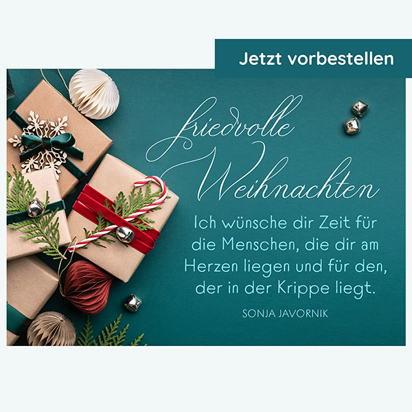 Postkarte im Format 14,8 x 10,5 cmText:Friedvolle Weihnachten. Ich wünsche dir Zeit für die Menschen, die dir am Herzen liegen und für den, der in der Krippe liegt.