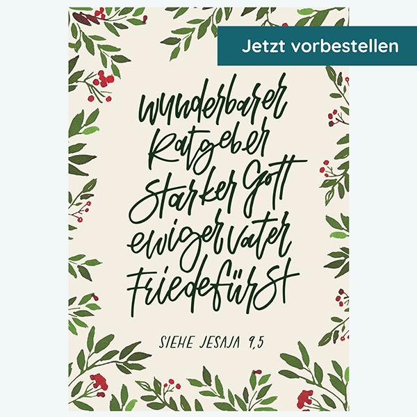 Postkarte im Format 14,8 x 10,5 cmText:Wunderbarer Ratgeber, starker Gott, ewiger Vater, Friedefürst. Siehe Jesaja 9,5