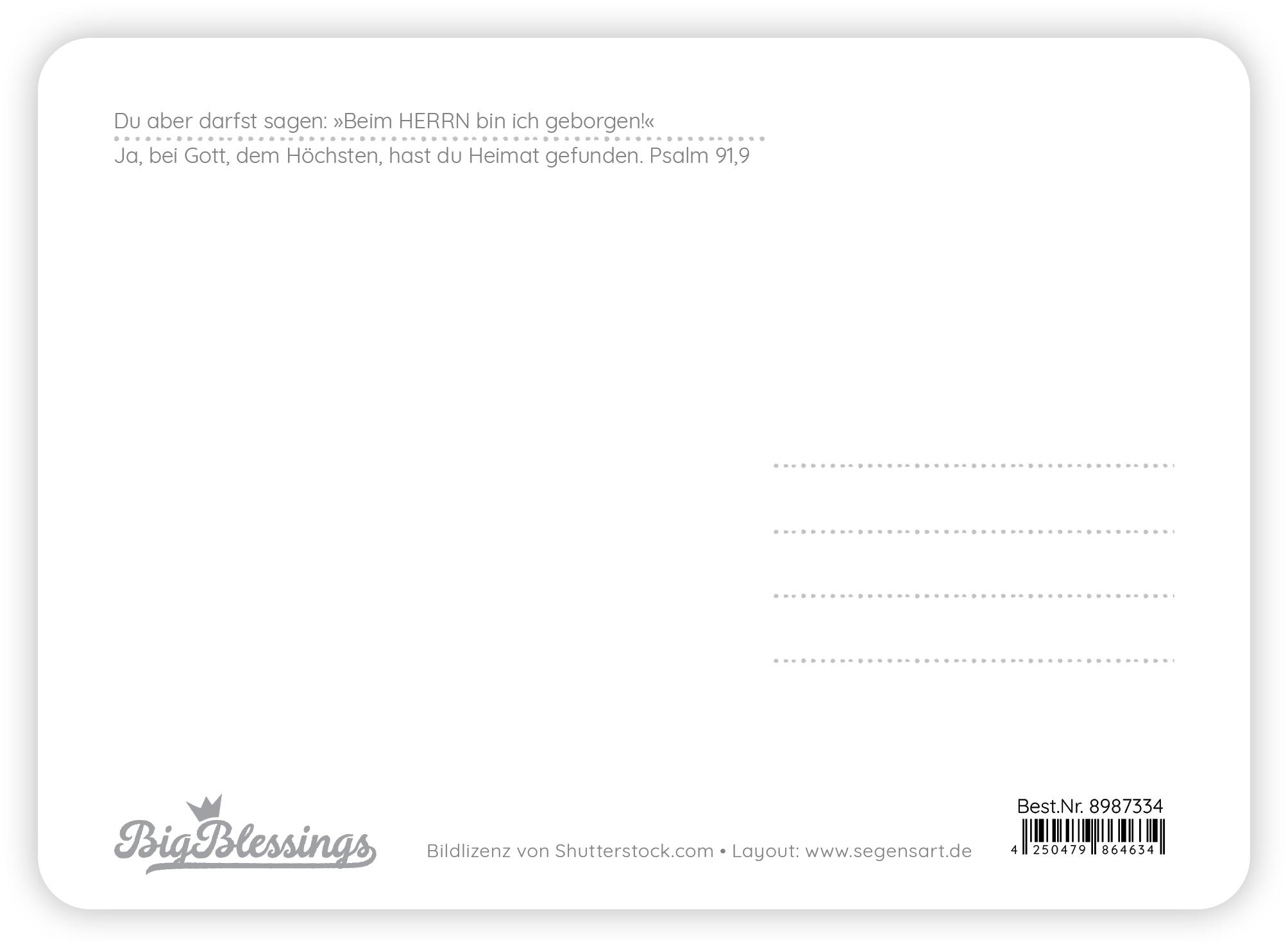 Große XL-Postkarte mit abgerundeten Ecken auf edlem Naturpapier, XL-Format 16 x 11,5 cm.Text:geborgenmit Text auf der Rückseite:Du aber darfst sagen: »Beim HERRN bin ich geborgen!« Ja, bei Gott, dem Höchsten, hast du Heimat gefunden.Ps 91,9