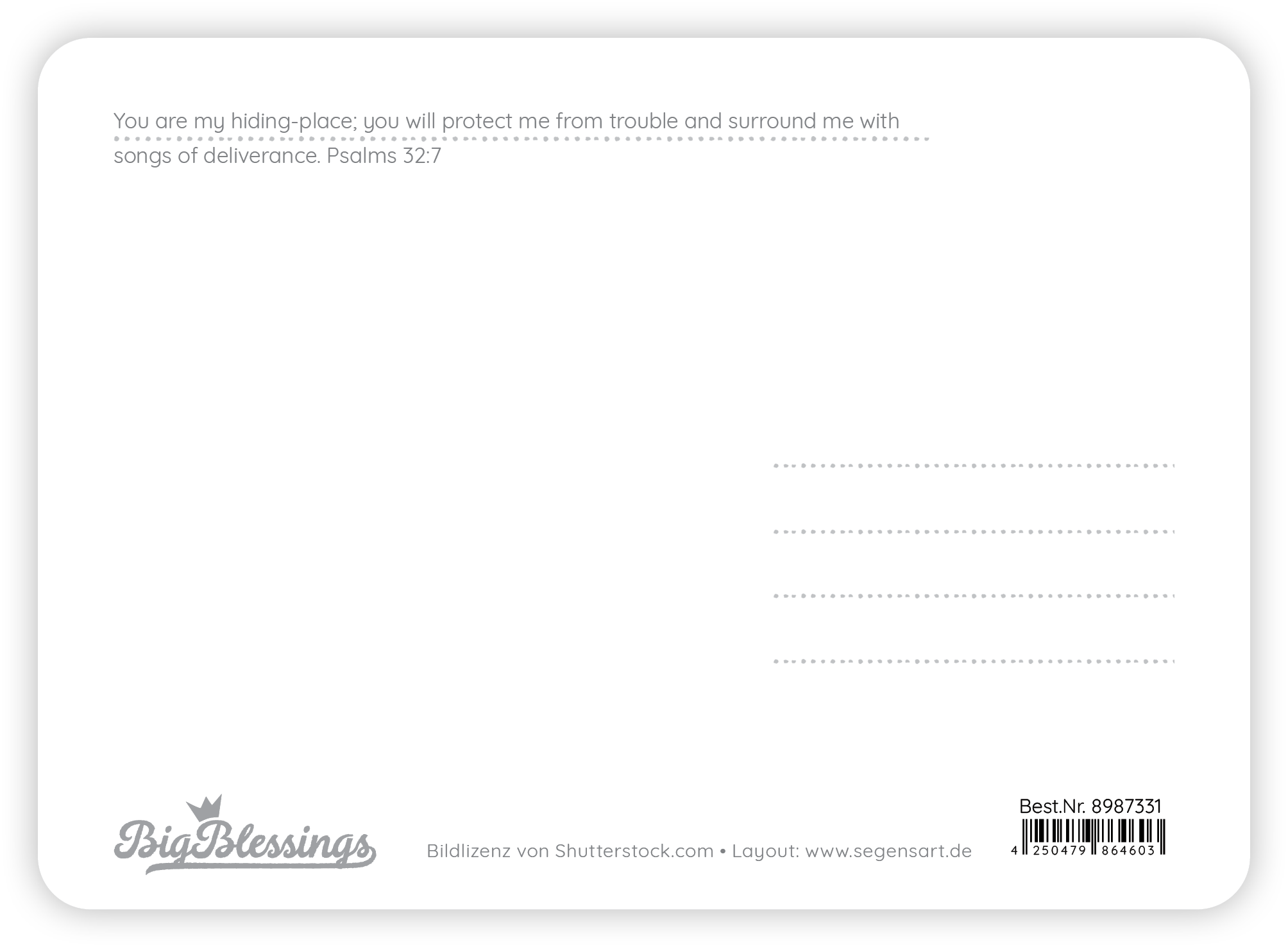Große XL-Postkarte mit abgerundeten Ecken auf edlem Naturpapier, XL-Format 11,5 x 16 cm.Text:Hiding placemit Text auf der Rückseite:You are my hiding-place; you will protect me from trouble and surround me with songs of deliverance. Psalms 32:7
