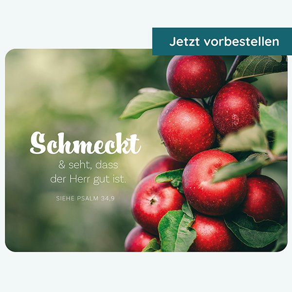 Siehe Psalm 34,9mit Text auf der Rückseite:Schmeckt und seht, dass der HERR gut ist. Freuen darf sich, wer auf ihn vertraut!