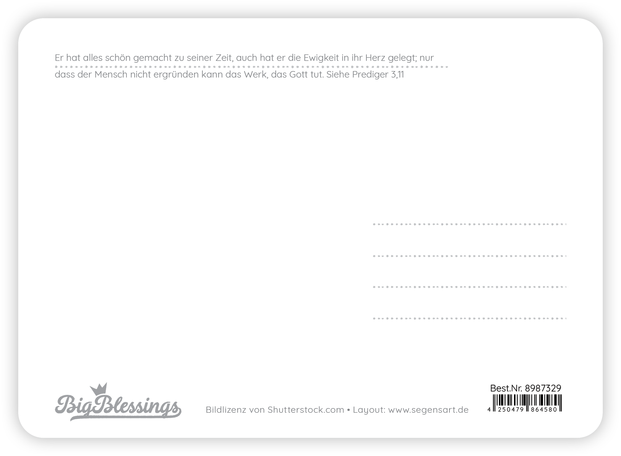 Große XL-Postkarte mit abgerundeten Ecken auf edlem Naturpapier, XL-Format 11,5 x 16 cm.Text:Wundervollmit Text auf der Rückseite:Er hat alles schön gemacht zu seiner Zeit, auch hat er die Ewigkeit in ihr Herz gelegt; nur dass der Mensch nicht ergründen kann das Werk, das Gott tut.Siehe Prediger 3,11